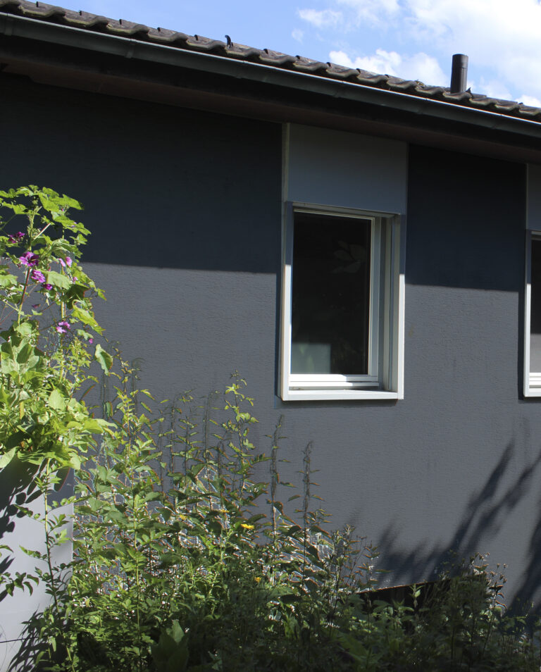 Das Haus aus den 1970er Jahren ist von Bäumen, Sträuchern, Stauden und Blumen umgeben. Die Architektur zeigt typische Gestaltungselemente dieser Zeit auf, wie die Balkonbrüstungen aus Waschbeton und die Stoffmarkise in einem kräftigen, leuchtenden und Buntton.